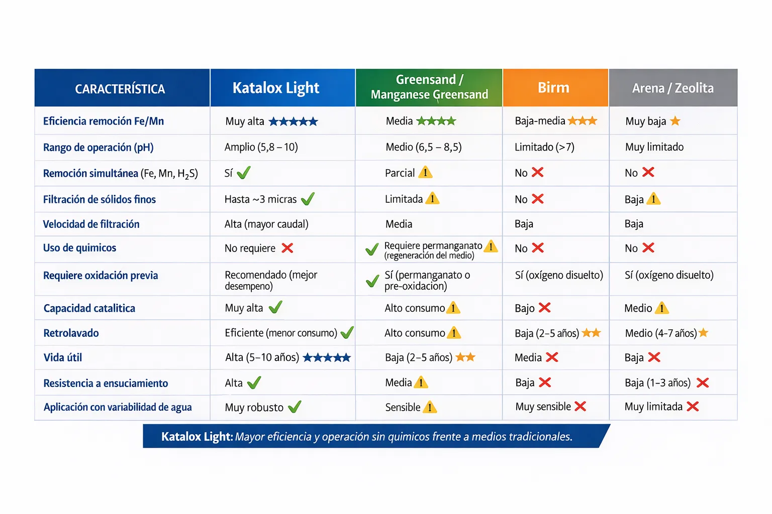 Katalox Light ofrece una mayor eficiencia de remoción, mayor vida útil y operación sin químicos, superando ampliamente a medios tradicionales como Greensand, Birm o arena.